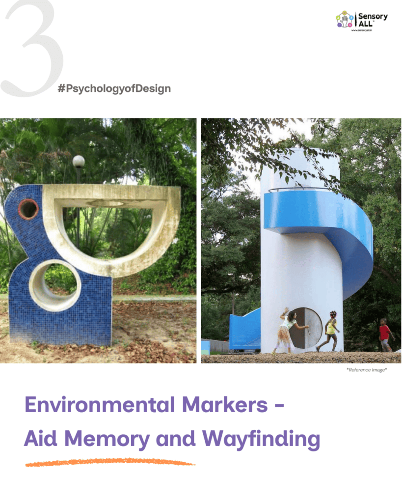 The hippocampus and entorhinal cortex are key brain areas involved in spatial navigation and memory. Studies show that recognizable visual patterns and distinct shapes support cognitive mapping and episodic recall, especially in people with memory retention challenges, including dementia and certain neurodivergent conditions like ADHD or autism. Incorporate distinctive, repetitive, and playful geometric forms—such as bold circles, spirals, or animal-like structures into spatial design to act as visual anchors and cognitive markers.